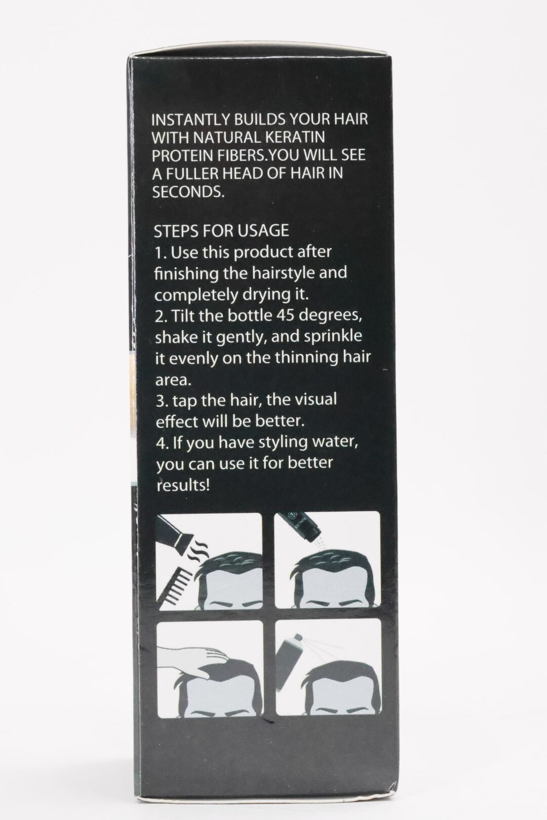 El producto contiene fibras de queratina natural que se adhieren al cabello mediante una carga estática, haciendo que el cabello se vea más grueso y voluminoso de inmediato. Proporciona cobertura instantánea para las áreas ralas, oculta la pérdida de cabello y también se puede usar como retoque de raíces entre tintes.